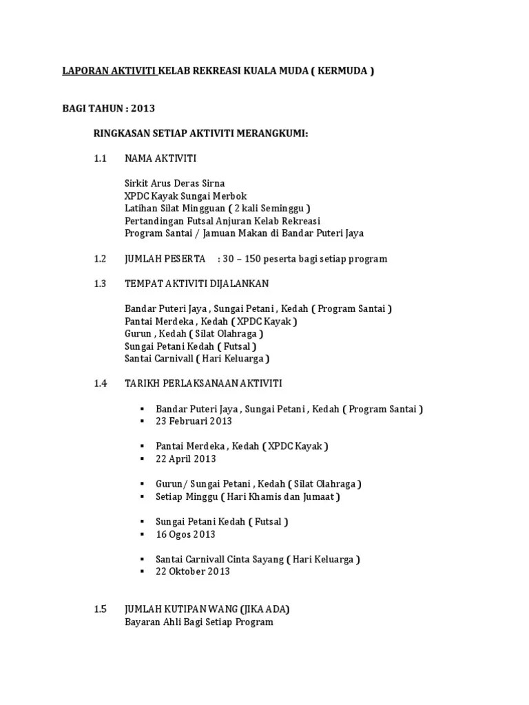 Program kelab sukan dan rekreasi pejabat kesihatan daerah manjung sepanjang tahun. Kelab ini dikenali sebagai kelab rekreasi dan inovasi/ recreation and. Masa kini rakyat malaysia banyak mengikuti ekspedisi yang hebat seperti berenang merentasi selat inggeris, mendaki gunung everest dan eksplorasi . Contoh kertas kerja untuk persatuan dan kelab bagi menjalankan aktiviti 2. Persatuan bahasa melayu sjkt ladang senawang disediakan oleh pn. Merancang dan melaksana aktiviti kerohanian seperti ceramah agama, usrah dan seumpamanya yang dapat membimbing akidah, jati diri, dan budaya kerja warga fpp.